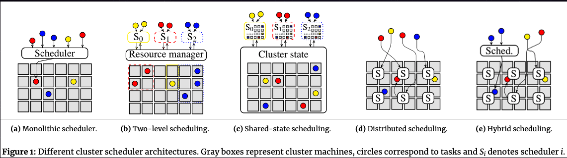 Many cluster schedulers – such as most high-performance computing (HPC) schedulers, the Borg scheduler, various early Hadoop schedulers and the Kubernetes scheduler – are monolithic. A single scheduler process runs on one machine (e.g., the JobTracker in Hadoop v1, and kube-scheduler in Kubernetes) and assigns tasks to machines. All workloads are handled by the same scheduler, and all tasks run through the same scheduling logic (Figure 1a). This is simple and uniform, and has led to increasingly sophisticated schedulers being developed. As an example, see the Paragon and Quasar schedulers, which use a machine learning approach to avoid negative interference between workloads competing for resources.